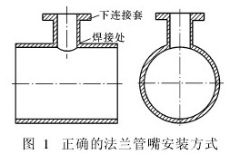 在管道開(kāi)孔安裝取壓短管時(shí),焊接取壓短管應(yīng)注意垂直方向,要求焊接后短管軸線(xiàn)與管道軸線(xiàn)夾角為90b,且法蘭短管連接的延長(zhǎng)線(xiàn)垂直通過(guò)管道橫截面的圓心,這樣能保證流體與磁場(chǎng)垂直,見(jiàn)圖1
