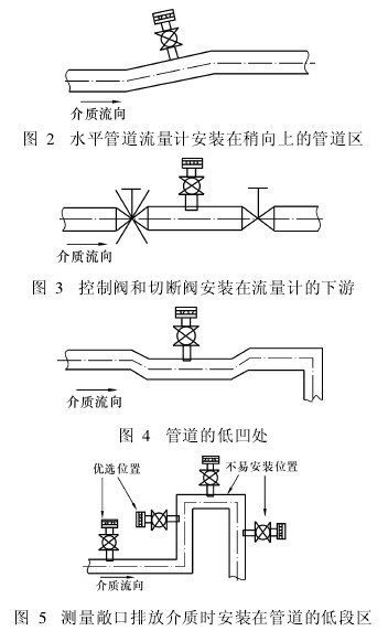 為了保障測(cè)量精度,傳感器應(yīng)避免在容易產(chǎn)生真空、氣體、渦流等地方安裝,傳感器與智能變送器之間的通訊電纜要避開(kāi)電動(dòng)機(jī)等強(qiáng)電設(shè)備。建議安裝在圖2~圖5所示位置。