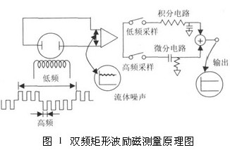 雙頻矩形波勵磁測量原理如圖1所示,一個由高低頻分量迭加而成的電磁場通過勵磁線圈被施加到被測液體中,勵磁波形是在一個低頻矩形波上迭加一個高于市電頻率的矩形波而得到的波形。在產(chǎn)生的電動勢中,低頻分量通過一個大時間常數(shù)的積分電路獲得一個零點(diǎn)穩(wěn)定性好的平穩(wěn)流量信號。而由漿液或低電導(dǎo)率流體產(chǎn)生的低頻噪聲可被不受噪聲影響的高頻采樣電路所抑制,有著同樣時間常數(shù)的流量信號經(jīng)過一個差分電路以確定流速信號的變化,把這兩種不同頻率采樣所得的信號結(jié)合起來可獲得一個穩(wěn)定流速信號,該信號不受噪聲干擾,且有較高的零點(diǎn)穩(wěn)定性。