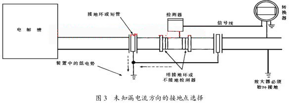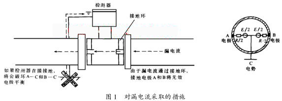 如果接地采用檢測器旁路方式(見圖 1), 電解槽的漏電流將通過 A—C 和 B—C 。如果不同的電流流過A 和 B 電* ,那么 A 和 B 電*之間的平衡就會不同 ,其結(jié)果將會飽和放大器 。如果接地采用接地環(huán)方式 ,且避開檢測器直接接地 ,漏電流對電*A 和 B 的影響將減至*小, 且有一個穩(wěn)定的 C電勢 ,其結(jié)果將會在液體中減少輸出波動, 且建立一個參考電勢 。
