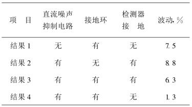 結(jié)果 4:直流噪聲抑制電路和檢測器不接地 ,接地環(huán)分流了漏電流,因而輸出波動遠(yuǎn)小于其他結(jié)果。