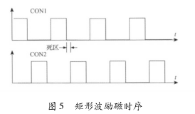 該電路主要由勵磁時序發(fā)生單元、三態(tài)緩沖器及隔離光耦組成。勵磁時序由dn50電磁流量計價格系統(tǒng)的控制核心產(chǎn)生。采用DSP的EPWM外設(shè)模塊,通過設(shè)定其內(nèi)部定時器的工作模式發(fā)出所要求的勵磁頻率的勵磁時序PWM信號CT_1和CT_2。由于勵磁控制系統(tǒng)中的勵磁工作電源的電壓要比DSP的工作電源電壓高得多,為防止勵磁電路故障對系統(tǒng)控制核心產(chǎn)生致命影響,采用光耦將控制部分與勵磁部分進行隔離。另外,由于DSP引腳的驅(qū)動能力有限,所以在DSP與隔離光耦之間加入三態(tài)緩沖器以驅(qū)動隔離光耦的輸入級。并且,DSP能夠通過GPIO口控制三態(tài)緩沖器上的使能引腳來使能和禁止勵磁,以在檢測到電路故障時迅速關(guān)斷H橋所有橋臂。該勵磁時序產(chǎn)生電路通過軟件編程可產(chǎn)生如圖5所示的單頻矩形波。在實際應(yīng)用中,由于組成H橋的達林頓三*管與MOS管導通與關(guān)斷的時間不一致,易在勵磁方向切換瞬間,產(chǎn)生上下橋臂同時導通的現(xiàn)象,反映在勵磁電流波形上為一幅值很高的窄脈沖。該脈沖電流不僅容易引起遲滯比較電路的誤輸出,從而導致高低壓切換電路與電流旁路電路的誤動作,而且對恒流控制電路產(chǎn)生沖擊,減小三端穩(wěn)壓芯片的使用壽命,同時還會產(chǎn)生EMC電磁干擾,給測量精度帶來影響。所以實際應(yīng)用時,如圖5所示對方波勵磁時序添加死區(qū),可以明顯減小上述現(xiàn)象。
