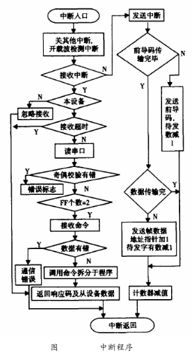 在HART通信中,智能法蘭式電磁流量計(jì)作為從設(shè)備進(jìn)行通訊,所以這里的軟件設(shè)計(jì)只是針對(duì)于從設(shè)備。HART通信采用水平和垂直校驗(yàn)的方法。當(dāng)檢測(cè)到接收數(shù)據(jù)有差錯(cuò)時(shí),則等到主設(shè)備命令幀發(fā)完后,通知主設(shè)備數(shù)據(jù)接收有誤。主設(shè)備則重新發(fā)命令幀,從而保證通信的準(zhǔn)確可靠。HART中斷子程序流程圖如圖6所示。由于HART通信為主從方式,HART幀中每個(gè)字節(jié)在物理層傳輸需要9ms左右,為了保證通訊的實(shí)時(shí)性,通訊程序采用串行口終端接收/發(fā)送。該中斷所要完成通信中的主要任務(wù),即接收和發(fā)送幀,幀的拆分和打包。