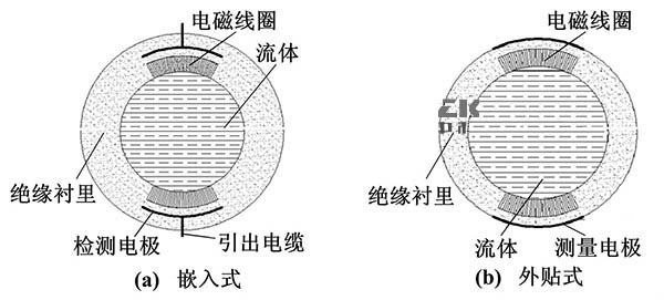 電容式150度高溫電磁流量計從根本上解決了電*表面附著、腐蝕、摩擦等問題,其電*與被測流體間有絕緣襯里隔離,或者直接采用絕緣測量管。電*置于測量管外面或鑲嵌于測量管內(nèi)部。嵌人式150度高溫電磁流量計和外貼式150度高溫電磁流量計的結(jié)構(gòu)如圖2所示。