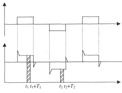 防爆電磁流量計(jì)一般都采用工頻交流電源供電, 其電源電壓的幅值和頻率的變化都會(huì)給防爆電磁流量計(jì)帶來(lái)電源性干擾噪聲。對(duì)電源電壓的幅值變化, 因采用多級(jí)集成穩(wěn)壓, 一般而言電源電壓的幅值變化對(duì)電磁流量的測(cè)量精度影響不大。當(dāng)電源電壓的頻率波動(dòng)時(shí), 雖然其波動(dòng)范圍有限, 但對(duì)防爆電磁流量計(jì)測(cè)量精度影響較大。為了解決工頻干擾問(wèn)題, 實(shí)現(xiàn)對(duì)流體流速感應(yīng)電勢(shì)eab信號(hào)的準(zhǔn)確測(cè)量, 需利用以下基本關(guān)系:①勵(lì)磁周期為工頻周期的整數(shù)倍, 即勵(lì)磁頻率為50/nHz(n為偶數(shù));②正負(fù)勵(lì)磁下的同相位采樣。圖2是對(duì)應(yīng)低頻矩形波勵(lì)磁形式下的典型電勢(shì)信號(hào)形式, 按上述關(guān)系在一個(gè)勵(lì)磁周期下, 若假設(shè)t1 和t2 點(diǎn)為工頻干擾的等效干擾點(diǎn), 且采樣寬度T=T1 =T2 , 則eab的基本算式為: