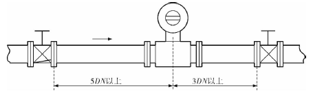 補水流量計的安裝質(zhì)量對其測量結(jié)果的影響較大,因此在安裝時需要注意幾個問題。*先,補水流量計直管段的選擇在配管時一定要按照要求進行選擇,一般選擇流量計通徑與工藝管道通徑相同,即可滿足工程需要,而且安裝方便、壓力損失小,流量計直管段上游側(cè)的長度不少于5倍工藝管道直徑,下游側(cè)的長度不少于3倍工藝管道直徑(圖2)。但在流速太慢而又要求精度較高或需要變徑的應(yīng)用場合,可選擇通徑小于工藝管道通徑的流量計,以提高測量精度,此時流量計上、下游必須加裝異徑管,且進口異徑管上游側(cè)應(yīng)有長于10倍工藝管道直徑的直管段,下游側(cè)應(yīng)有長于5倍工藝管道直徑的直管段(圖3)。