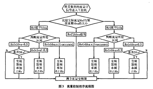 實(shí)際生產(chǎn)中流量一直在某個(gè)區(qū)域內(nèi)波動(dòng),且其動(dòng)態(tài)特性不易掌握。從上面的理論中我們能夠讓誤差△£盡可能的小,這樣距我們所需要的理論值%就越接近。而減小誤差需要我們把n取的盡可能大,也就是在生產(chǎn)時(shí)間內(nèi)劃分更多的周期去調(diào)節(jié)流量。當(dāng)工控機(jī)根據(jù)雙氧水計(jì)量表傳送回來的信號(hào)發(fā)出調(diào)節(jié)變頻器工作頻率的指令后,電機(jī)調(diào)整功率到雙氧水計(jì)量表的實(shí)際測(cè)量為一個(gè)工作周期,我們知道從指令發(fā)送到實(shí)際測(cè)量值返回有一個(gè)較大的滯后,如果調(diào)節(jié)的周期時(shí)間小于流量計(jì)本身的一個(gè)工作周期,那么顯然不可能達(dá)到減小誤差的目的。利用模糊控制思想H。,在控制程序中我們把流量的波動(dòng)區(qū)域劃分為±缸×Yo,Yo-t-O.3,Yo±0.5四個(gè)區(qū)域,其中缸為可調(diào)節(jié)的誤差范圍,生產(chǎn)中我們?nèi)?.015,流量區(qū)域劃分的單位均為t/h。針對(duì)不同的區(qū)域采取不同的調(diào)整方案。具體流程如圖3所示。圖中變量Rel表示實(shí)際測(cè)量的流量,變量Idea表示理論流量。