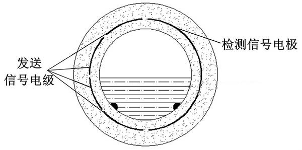 ③利用阻抗或信號(hào)衰減研制的非滿管氯化鐵流量計(jì)。這種結(jié)構(gòu)的非滿管氯化鐵流量計(jì)是當(dāng)前國(guó)內(nèi)研究的方向之一。其結(jié)構(gòu)是流量管底部貼一對(duì)信號(hào)發(fā)射電*,在流量管中間貼信號(hào)接收電*。由于信號(hào)在流體中傳播會(huì)產(chǎn)生衰減,且傳播時(shí)間越長(zhǎng),衰減越多,因此通過信號(hào)接收電*接收到的信號(hào)衰減量即可得知液面高度;同時(shí)該電*還能測(cè)量流體切割磁感線產(chǎn)生的電動(dòng)勢(shì),以此達(dá)到測(cè)量非滿管流量的目的。阻抗式或信號(hào)衰減非滿管氯化鐵流量計(jì)結(jié)構(gòu)簡(jiǎn)圖如圖5所示。