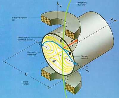 當導電液體沿測量管在交變磁場與磁力線成垂直方向運動時,導電液體切割磁力線產(chǎn)生感應電勢。在與測量管軸線和磁力線相互垂直的管壁上安裝了一對檢測電*,將這個感應電勢檢出。