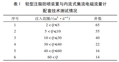 在實(shí)際應(yīng)用中,使用輕型注脂防噴裝置與內(nèi)流式集流一體式電磁流量計(jì)配套技術(shù)對(duì)喇叭口在射孔層上注聚井進(jìn)行測(cè)試。輕型注脂防噴裝置與內(nèi)流式集流一體式電磁流量計(jì)配套技術(shù)施工工藝參見(jiàn)文獻(xiàn),測(cè)試情況見(jiàn)表 1 所示,低注入量井( ≤10 m3 /d) 占到 56. 60% 。