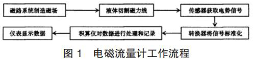 智能電磁流量計(jì)的產(chǎn)生主要是基于法拉*電磁感應(yīng)定律。在智能電磁流量計(jì)的應(yīng)用中,磁路系統(tǒng)會(huì)在流量計(jì)運(yùn)行過程中逐步出現(xiàn)直流磁場與交流磁場,該磁場的產(chǎn)生為后期的測量提供了良好的前提條件,營造了測量所需的磁場環(huán)境,因此,在智能電磁流量計(jì)應(yīng)用時(shí),一旦被測液體在導(dǎo)管中經(jīng)過該磁場環(huán)境時(shí),必然會(huì)產(chǎn)生一定的切割磁力線運(yùn)動(dòng),在這種情況下,電*傳感器就會(huì)發(fā)揮其作用,將導(dǎo)管內(nèi)的流量轉(zhuǎn)換為感應(yīng)電勢信號(hào),隨后此轉(zhuǎn)換形成的信號(hào)逐步被傳遞給轉(zhuǎn)換器。而轉(zhuǎn)換器更是可以將所獲得的流量信號(hào)等加以處理,通過分析、對比等,轉(zhuǎn)換器會(huì)將該信號(hào)變?yōu)闃?biāo)準(zhǔn)信號(hào),隨后將該信號(hào)輸出給積算儀,進(jìn)一步進(jìn)行信號(hào)的處理,這些處理以后的信號(hào)*終會(huì)在智能電磁流量計(jì)的儀表中顯示,呈現(xiàn)*終的流量測量結(jié)果,其基本的流程如圖 1 所示。