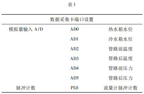 數(shù)據(jù)采集系統(tǒng)由工控機(jī)、熱水流量計(jì)以及數(shù)據(jù)采集卡組成。 4000 次冷熱沖擊試驗(yàn)要求在在*大流量 qs 條件下運(yùn)行,對(duì)流量數(shù)據(jù)的采集用到熱水流量計(jì)及數(shù)據(jù)采集卡。熱水流量計(jì)采集管路流量,數(shù)據(jù)采集卡將熱水流量計(jì)采集到的數(shù)據(jù)反饋給工控機(jī)系統(tǒng)。過(guò)程中,試驗(yàn)管路水溫以及水箱水位的采集控制也是通過(guò)數(shù)據(jù)采集卡反饋給系統(tǒng)控制。試驗(yàn)過(guò)程用到的數(shù)據(jù)采集卡采用研華生產(chǎn)的PCI - 1711。PCI - 1711 是一款多功能 PCI 總線數(shù)據(jù)采集卡,具有 16 路單端模擬量輸入功能、2 路 12位模擬量輸出功能、16 路數(shù)字輸入和 16 路數(shù)字輸出功能、計(jì)數(shù)器功能等。為保證冷熱沖擊試驗(yàn)結(jié)果的準(zhǔn)確性,嚴(yán)要求嚴(yán)格控制管路流量以及管路壓力。因此,管路設(shè)置前后管路溫度、冷熱水箱水位以及管路壓力的采集,管路流量根據(jù)熱水流量計(jì)脈沖計(jì)數(shù)進(jìn)行采集,其數(shù)據(jù)采集卡端口設(shè)置如表 1 所示。