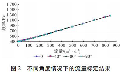為了考察井眼斜度變化對石灰水流量計(jì)量表測量流量的影響,開展了非集流石灰水流量計(jì)量表在不同斜度情況下的流量測量模擬實(shí)驗(yàn)。模擬實(shí)驗(yàn)在大慶油田多相流實(shí)驗(yàn)室進(jìn)行,儀器外徑 38 mm,模擬井筒內(nèi)徑為 124 mm,實(shí)驗(yàn)介質(zhì)是水,傾斜角度分別為 0°、40°、80°和 90°( 水平) ,流量范圍為 5 ~ 850 m3 /d。實(shí)驗(yàn)結(jié)果表明,在儀器居中條件下,井眼斜度變化對石灰水流量計(jì)量表的儀表常數(shù)沒有影響,滿量程誤差不大于 4% ,因此可以應(yīng)用石灰水流量計(jì)量表進(jìn)行水平井注水剖面測量。不同角度情況下的實(shí)驗(yàn)結(jié)果如圖 2 所示。