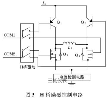 由圖 3 可知,I o 為高低壓切換恒流控制電路輸出的恒流源電流,H 橋驅(qū)動(dòng)的 COM1 端控制三*管 Q 1和場效應(yīng)管 Q 4 的通斷;COM2 端控制三*管 Q 2 和場效應(yīng)管 Q 3 的通斷。L 1 表示的是勵(lì)磁線圈(傳感器中線圈),COM1、COM2 為正交的 PWM 波信號,因此在勵(lì)磁線圈 L 1 的兩端會產(chǎn)生方波勵(lì)磁信號。檢流電路主要是用來檢測勵(lì)磁線圈中電流的變化,當(dāng)線圈中的勵(lì)磁電流方向變化時(shí),可以及時(shí)將此信息反饋給高低壓切換恒流控制電路中的比較器,從而實(shí)現(xiàn)切換高低壓源達(dá)到恒流控制的目的。
