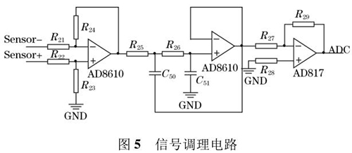 如圖4 所示,信號調(diào)理電路由前置放大電路、濾波電路以及二次放大電路組成。其中前置放大電路主要是由 AD8610 組成的差分放大電路構(gòu)成,其主要是去除信號中的共模干擾并且進(jìn)行*一次前置放大,前置放大電路的放大倍數(shù)為 15。由于有效信號的幅值很小,經(jīng)過前置放大電路后信號中還存在很多高頻雜波,這些雜波會影響對后級信號的處理,因此還需要對前置放大電路輸出的信號進(jìn)行低通濾波和二次放大。系統(tǒng)選用二階有源低通濾波電路濾除信號中的高頻干擾,低通濾波的截止頻率設(shè)定在 6 kHz 左右,選用 AD817 組成的二次放大電路對濾波電路輸出的信號進(jìn)行二次放大,將信號調(diào)理電路輸出的信號調(diào)整在 0~5 V 之間,*終利用 DSP 內(nèi)部的 AD 轉(zhuǎn)換器對此信號進(jìn)行模數(shù)轉(zhuǎn)換得出傳感器線圈輸出的感應(yīng)電動(dòng)勢,從而根據(jù)相關(guān)的公式計(jì)算得出管道中液體的流量。具體電路圖如圖 5 所示。
