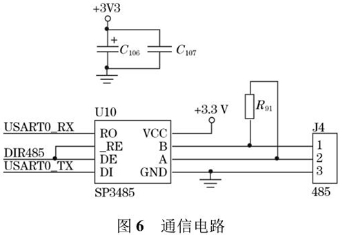 智能分體式電磁流量計(jì)輸出的流量值可以通過外接的 TFTLCD 屏直接顯示,還可以通過預(yù)留的 RS485 通信接口將數(shù)據(jù)發(fā)送到上位機(jī)中。RS485 電路*大的優(yōu)點(diǎn)是 485 電平與 TTL 電平兼容,方便與 TTL 電路相連;抗共模干擾能力強(qiáng);數(shù)據(jù)傳輸速度快,高達(dá) 10 Mbps;通信距離遠(yuǎn),*大為 1.2 km。系統(tǒng)采用 SP3485 芯片進(jìn)行數(shù)據(jù)通信,SP3485 是一款低功耗芯片且符合RS485 協(xié)議的收發(fā)器,電路圖如圖 6 所示。
