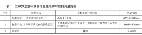 本規(guī)范包含三種校準(zhǔn)方法,分別為標(biāo)準(zhǔn)表法 1(外夾式超聲流量計(jì))、標(biāo)準(zhǔn)表法 2(串聯(lián)移動(dòng)式在線校準(zhǔn)裝置)和稱重法,編制組對(duì)每種方法進(jìn)行了大量的實(shí)驗(yàn),并積*與JKM-LDE電磁流量計(jì)生產(chǎn)廠家及用戶溝通探討,積累了豐富的經(jīng)驗(yàn),獲得了大量的實(shí)驗(yàn)數(shù)據(jù),*終確定三種方法的主標(biāo)準(zhǔn)器計(jì)量性能和對(duì)應(yīng)的測(cè)量范圍,如表 1 所示。