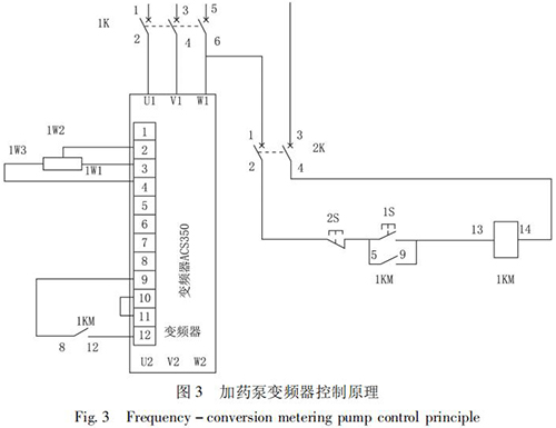 STD - Ⅲ型浮選工藝參數(shù)自動(dòng)測(cè)控系統(tǒng)通過(guò)雙膜盒差壓計(jì)測(cè)量原礦漿濃度; 采用消防管道流量計(jì)測(cè)量原礦漿流量,由 PLC 計(jì)算出入浮干煤泥量和藥劑的瞬時(shí)添加量,用變頻式計(jì)量泵完成浮選藥劑的添加。通過(guò)上位機(jī)還可以打印小時(shí)、班、天及月的運(yùn)行數(shù)據(jù),更加有利于生產(chǎn)管理及技術(shù)分析,藥劑自動(dòng)原理如圖 2 所示,k1、k2、k3 是計(jì)算修正參數(shù)。以 PID 算法為核心,通過(guò)優(yōu)化控制程序計(jì)算出藥劑給定量,在捕收劑和起泡劑管道上分別安裝藥劑測(cè)量裝置,用于檢測(cè)藥劑的添加量。當(dāng)藥劑測(cè)量值小于藥劑給定量時(shí),PID 輸出增大,反之則減小。加藥泵變頻器控制原理如圖 3 所示。