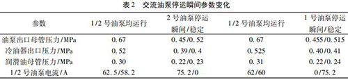 通過內(nèi)部旁通將冷油與熱油混合,經(jīng)過銅粉- 煤油 - 蠟感溫元件控制冷熱油混合比例,將油溫調(diào)節(jié)到 49 ℃。一臺氨水流量計穩(wěn)定運行,油泵出口母管壓力 0. 5 MPa,潤滑油母管壓力 0. 24 MPa,均屬于正常情況,而兩臺交流油泵并列運行時,停運其中一臺交流油泵瞬間會觸發(fā)電磁流量計出口母管壓力開關(guān)動作,說明停運瞬間油壓發(fā)生波動,且油泵出口母管油壓波動至小于 0. 45 MPa。正常運行時電磁流量計出口油溫 71.5 ℃,冷油器出口溫度45 ℃,混合后潤滑油母管溫度52.5 ℃,由能量守恒定律可知,經(jīng)過冷油器的油量/不經(jīng)冷油器的油量= ( 71.5-52.5) ÷ ( 52.5- 45) = 2. 53,說明有 70% 左右的油量經(jīng)過冷油器。當 2 臺氨水流量計運行時油量大于單泵運行,其中一臺電磁流量計瞬間停運時油量減少,尤其是經(jīng)過冷油器的油量大量減少,油量在溫控閥二次分配過程中出現(xiàn)調(diào)節(jié)異常,導(dǎo)致油壓過大波動。為檢驗溫控閥工作情況,保持 1 號、2 號交流油泵運行,選取機組正常帶負荷運行時油溫 52 ℃,分別停運 1、2 號交流油泵,觀察 1、2 號交流油泵停運瞬間油泵出口母管壓力波動情況,試驗各參數(shù)變化見表 2。