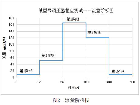 該測試主要利用實(shí)驗(yàn)室測試條件,模擬客戶現(xiàn)場使用情況。其主要測試內(nèi)容包括:測試電磁流量計在+23℃,-30℃和-40℃三種溫度下,電磁流量計出口壓力分別在2.1kPa和30kPa時,流量分別從*1階梯到*5階梯時的響應(yīng)速度,客戶所提供的流量階梯如圖2所示。橫軸表示下游球閥開啟動作時間,縱軸表示循環(huán)水流量計下游需要的流量q。