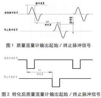 將循環(huán)水流量計(jì)流量與相關(guān)測試設(shè)備連接起來,就可以進(jìn)行循環(huán)水流量計(jì)的校準(zhǔn),時(shí)間差△ t 由專用試驗(yàn)測試設(shè)備可以測出。起始脈沖信號(hào)和終止脈沖信號(hào)如圖 1 所示。經(jīng)過專用試驗(yàn)測試設(shè)備信號(hào)轉(zhuǎn)化后的信號(hào)方波如圖 2 所示。