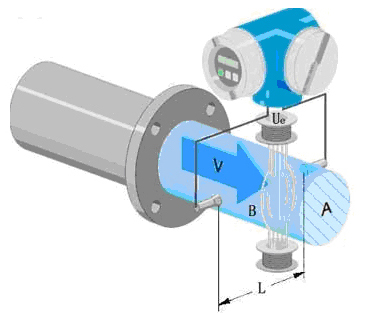據(jù)法拉*電磁感應原理,在與測量管軸線和磁力線相垂直的管壁上安裝了一對檢測電*,當導電液體沿測量管軸線運動時,導電液體切割磁力線產(chǎn)生感應電勢,此感應電勢由兩個檢測電*檢出,數(shù)值大小與流速成正比例,其值為: