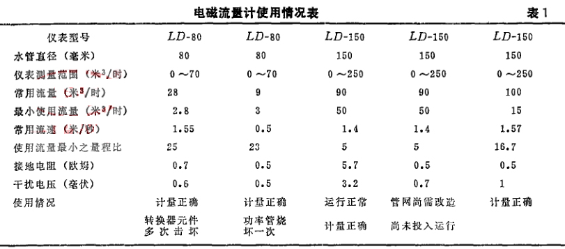 我廠自1981年3一8月,分別對四個車間的用水點安裝了五臺儀表,每臺配用一支DX S-102積算器,測定的是生產(chǎn)用水,溫度為常溫,電導(dǎo)率為1.2x10-3姆歐,安裝方式為水平有旁路伐(見表1)。