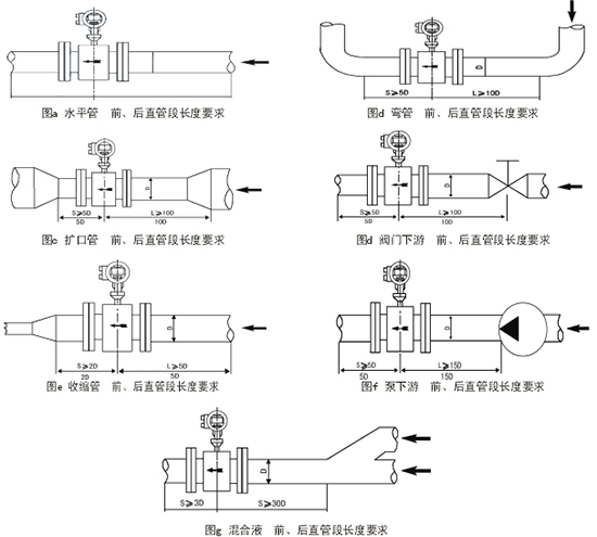 6.測(cè)量不同液體的混合介質(zhì)時(shí),傳感器應(yīng)安裝在混合點(diǎn)的上游,如安裝在下游,必須裝在混合已經(jīng)均勻或化學(xué)反應(yīng)充分完成段;