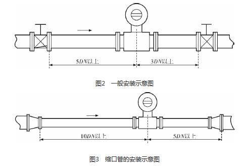 dn200污水流量計(jì)的安裝質(zhì)量對(duì)其測(cè)量結(jié)果的影響較大,因此在安裝時(shí)需要注意幾個(gè)問題。*先,dn200污水流量計(jì)直管段的選擇在配管時(shí)一定要按照要求進(jìn)行選擇,一般選擇流量計(jì)通徑與工藝管道通徑相同,即可滿足工程需要,而且安裝方便、壓力損失小,流量計(jì)直管段上游側(cè)的長度不少于5倍工藝管道直徑,下游側(cè)的長度不少于3倍工藝管道直徑(圖2)。但在流速太慢而又要求精度較高或需要變徑的應(yīng)用場(chǎng)合,可選擇通徑小于工藝管道通徑的流量計(jì),以提高測(cè)量精度,此時(shí)流量計(jì)上、下游必須加裝異徑管,且進(jìn)口異徑管上游側(cè)應(yīng)有長于10倍工藝管道直徑的直管段,下游側(cè)應(yīng)有長于5倍工藝管道直徑的直管段(圖3)。