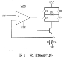 以往的激磁電路的設(shè)計(jì)都是采用恒流源和可控開關(guān)電路組成。恒流源是由電壓基準(zhǔn)、比較放大、控制調(diào)整和采樣等部分組成的直流負(fù)反饋?zhàn)詣诱{(diào)節(jié)系統(tǒng),常用的激磁電路就是用串聯(lián)調(diào)整型恒流電源盒控制開關(guān)組成的,如圖1。其中Vref是參考電壓,Rs是采樣電阻,Is為流過Rs的電流,就是所需的恒流,RL為電磁流量傳感器線圈,K1、K2、K3、K4為可控開關(guān),以達(dá)到使線圈RL中流經(jīng)正負(fù)交換的電流,對傳感器激磁。