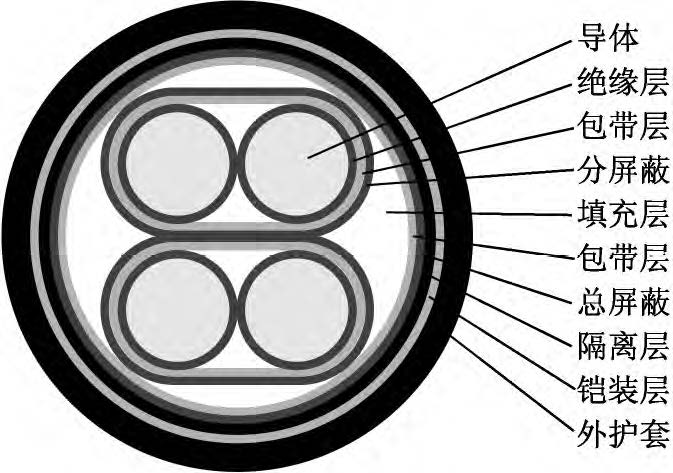 該新型電纜的結(jié)構(gòu)如圖1所示。導(dǎo)體為單股退火鍍錫軟銅線,以提高導(dǎo)體的導(dǎo)電性和防腐蝕性。在導(dǎo)體外繞包一層?。疲矗ň鬯姆蚁┌雽?dǎo)電帶,有利于降低導(dǎo)體和絕緣之間的摩擦起電噪音。絕緣采用材料較為純凈、介電常數(shù)較小、具有一定彈性的聚丙烯絕緣級材料,并采用擠壓式擠出,減小絕緣層與導(dǎo)體的間隙。采用對絞組作為信號傳輸線,由于在兩根傳輸線上感應(yīng)的電壓接近相等,減小了電壓差值,提高了信號傳輸穩(wěn)定性;對絞組由兩種不同顏色絕緣線芯組成,相鄰線對對絞節(jié)距應(yīng)不大于100mm。對絞分屏蔽組(即對對絞組進行分屏蔽,每對對絞組外繞包兩層聚酯帶和一層厚0.04mm鋁塑復(fù)合帶繞包,內(nèi)置一根7×0.26mm鍍錫銅絞線作引流線)有利于對不同對絞組之間信號串音的抑制和隔離。對絞分屏蔽組同心式絞合成纜,在對絞分屏蔽組間填充非吸濕性材料,以保證纜芯圓整。在成纜纜芯外繞包兩層聚酯帶,再采用鋁塑復(fù)合帶繞包,內(nèi)置鍍錫銅線作引流線,以提高電纜電磁屏蔽能力??偲帘螌油鈹D包隔離層(隔離護套),隔離層采用絕緣級低密度聚乙烯材料。隔離層外采用鎧裝層,鎧裝材料為高導(dǎo)磁合金鋼帶,其為強磁材料,可將外來的磁通大部分限制在鎧裝層的外表面上(僅有少部分能進入被屏蔽的空間);鎧裝時對高導(dǎo)磁合金鋼帶采用縱包焊接,確保其形成一連續(xù)圓柱管;鎧裝層可提高電纜抗電磁干擾水平以及對電纜進行加強,減少電纜振動引起的電動勢。外護套采用藍色軟PVC(聚氯乙烯)護層級電纜材料擠包,實現(xiàn)電纜防護。