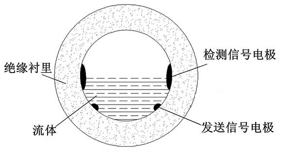 ①多電*式非滿管水處理流量計(jì)。其底部是一對(duì)信號(hào)注人電*,中間有多對(duì)測量電*,頂端有一個(gè)滿管電*。在滿管情況下,該流量計(jì)與普通的水處理流量計(jì)的功能相同,滿管情況下流體的橫截面積是固定的,此時(shí)計(jì)算流量值只需要測量流體的流速即可。當(dāng)流體非滿管時(shí),滿管電*檢測到管道非滿狀態(tài),利用算法修正測量值,此時(shí)流量計(jì)的測量方式改成測量流體流速和液面高度。信號(hào)注人電*與在不同位置的三對(duì)測量電*共同工作,用于測量液位面的高度和流體的速度。多電*式非滿管水處理流量計(jì)結(jié)構(gòu)簡圖如圖3所示。