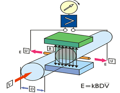 與此相仿.在磁感應(yīng)強(qiáng)度為B的均勻磁場(chǎng)中,垂直于磁場(chǎng)方向放一個(gè)內(nèi)徑為D的不導(dǎo)磁管道,由上式可見,體積流量qv與感應(yīng)電動(dòng)勢(shì)e和測(cè)量管內(nèi)徑D成線性關(guān)系,與磁場(chǎng)的磁感應(yīng)強(qiáng)度B成反比,與其它物理參數(shù)無(wú)關(guān).這就是電磁流量計(jì)的測(cè)量原理.