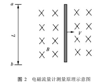 本文選用不同質(zhì)量濃度的煤泥在裝有電磁流量計的液壓與流變試驗臺上(實驗原理如圖1)進行管道輸送實驗。電磁流量計根據(jù)電磁感應(yīng)原理測量流過管道中導(dǎo)電流體的流量,故使用電磁流量計的前提是被測流體必須導(dǎo)電,且電導(dǎo)率不能低于閾值(即下限值)。通用型電磁流量計的閾值在(5×10-6)S/cm~10-4S/cm之間,若電導(dǎo)率低于閾值會產(chǎn)生誤差甚至不能測量。根據(jù)電磁感應(yīng)原理(如圖2),當(dāng)導(dǎo)電流體在磁場強度為B的磁場中切割磁力線時,在線形長度為L的a和b兩點之間會產(chǎn)生感應(yīng)電動勢,為