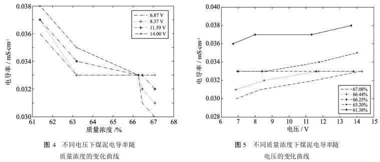 圖4的電導(dǎo)率變化曲線表明,隨著煤泥質(zhì)量濃度的增大,其電導(dǎo)率逐漸降低,并在質(zhì)量濃度為66%時相交于一點;圖5的電導(dǎo)率變化曲線表明,隨著電壓的增大,電導(dǎo)率有逐漸增大趨勢。分析圖4與圖5可得到以下結(jié)論: