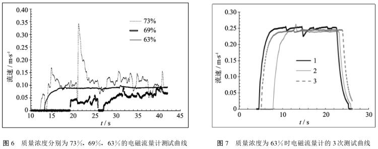 *先分析電磁流量計流速數(shù)據(jù)的重復(fù)性。圖6是當(dāng)管內(nèi)流速為0.1m/s(即濃密膏體輸送流速下限)時,電磁流量計測量由大到小的3種質(zhì)量濃度分別為73%,69%,63%的煤泥的實時數(shù)據(jù)曲線。由圖可見濃度較高時電磁流量計難以測出穩(wěn)定的流速數(shù)值,而當(dāng)濃度較低且煤泥流動性非常好時測量數(shù)值較為穩(wěn)定。圖7是質(zhì)量濃度為63%時電磁流量計的3次測試曲線,可見其重復(fù)性良好,故測量結(jié)果可信。相比較煤泥電導(dǎo)率的測試結(jié)果,可以看出當(dāng)質(zhì)量濃度低于63%時,電導(dǎo)率較大,且不同質(zhì)量濃度下電導(dǎo)率變化穩(wěn)定。故推測當(dāng)質(zhì)量濃度低于63%,電導(dǎo)率高于0.035mS/cm時,電磁流量計應(yīng)用于煤泥管道輸送時數(shù)據(jù)準(zhǔn)確性較高。