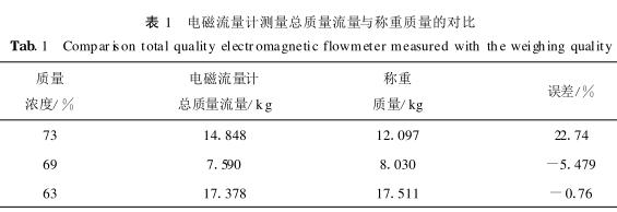 其次提取電磁流量計的流速數(shù)據(jù)換算并積分后與稱重質(zhì)量進行對比,分析其數(shù)據(jù)誤差,結(jié)果如表1??梢酝ㄟ^電磁流量計積分后的總流量與稱重數(shù)據(jù)的吻合程度來分析,若二者吻合較好則說明電磁流量計在線測量數(shù)據(jù)顯示雖然可能受到氣泡的影響,但是總流量可以準(zhǔn)確測量;若二者相差較大,則說明電磁流量計不適合對較高質(zhì)量濃度煤泥進行測量。從表1可以看出電磁流量計在質(zhì)量濃度為69%,73%時誤差較大,故測量不準(zhǔn)確;在質(zhì)量濃度為63%時測量誤差較小,說明其測量較準(zhǔn)確。該對比實驗與之前的重復(fù)性分析相符,說明用質(zhì)量濃度及電導(dǎo)率來評價電磁流量計測量數(shù)據(jù)的準(zhǔn)確性有一定的可行性。