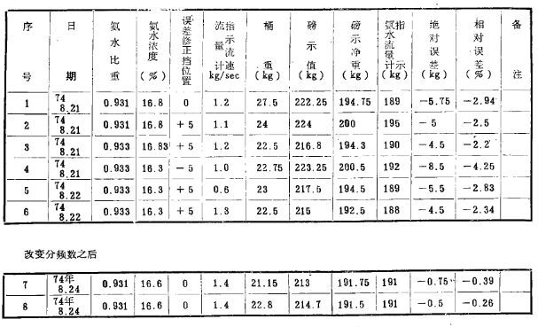 測試方法:將氨水通過流量計計量后,放入氨水桶,用磅秤稱其重量,以磅秤示數(shù)為標(biāo)準(zhǔn),求氨水流量計之誤差。現(xiàn)將幾次典型實(shí)測數(shù)據(jù)列表于后: